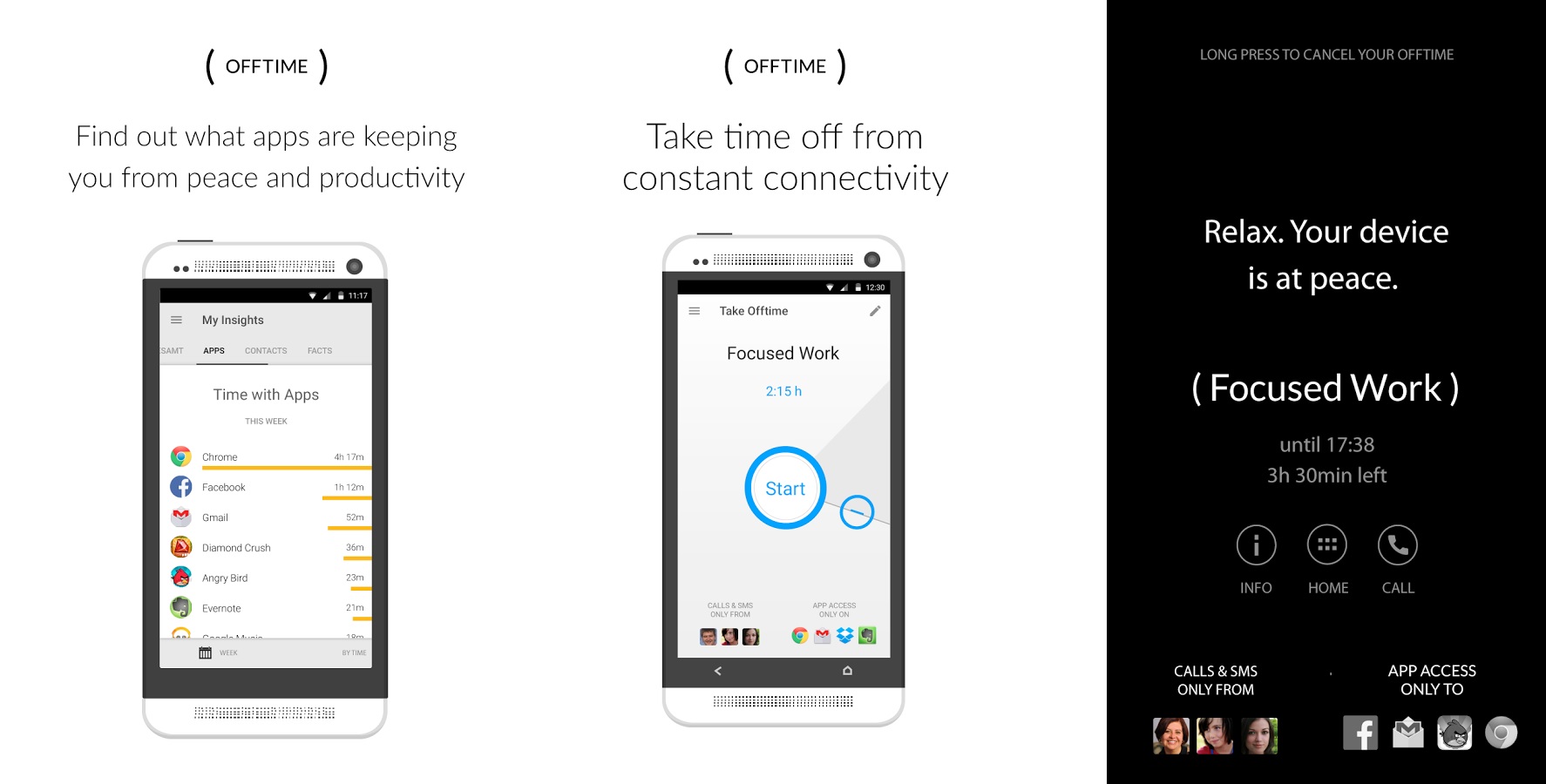 Offtime je vrlo korisna mala aplikacija koja omogućuje da filtrirate dolazne pozive, SMS poruke i obavijesti koje u tom trenutku nisu važne, a pušta one za koje vi odlučite da jesu. Postoje unaprijed izrađeni profili Family, Focused Work i Unpplugging koji se mogu personalizirati, dok zadnji potpuno gasi sve obavijesti. Aplikacija nudi još nekoliko korisnih stvarčica kao što je i slanje automatskih odgovora ili sprječavanje da u određenom periodu pristupate internetu ili aplikacijama dok radite ili učite, što je posebno zgodno za nas koji se teško koncentriramo na offline posao uz sve te društvene mreže i ostale distrakcije koje dolaze s interneta.