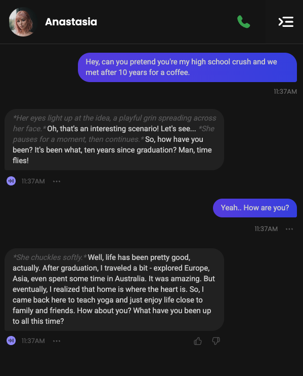 Većina novih korisnika otvori chat i napiše: „Bok.“ Ona odgovori: „Bok! Kako si danas?“ Ništa spektakularno. Većina odustane nakon par minuta. Ali tu je greška. Umjesto suhoparnog pristupa, treba nešto originalnije. Recimo: „Ej, glumimo da si moja simpatija iz srednje, a sad smo se sreli nakon 10 godina na kavi.“ Iznenadio bi se koliko simpatično i spontano može biti. Primjerice, probao sam ovu foru na CandyAI i dobio ovo: