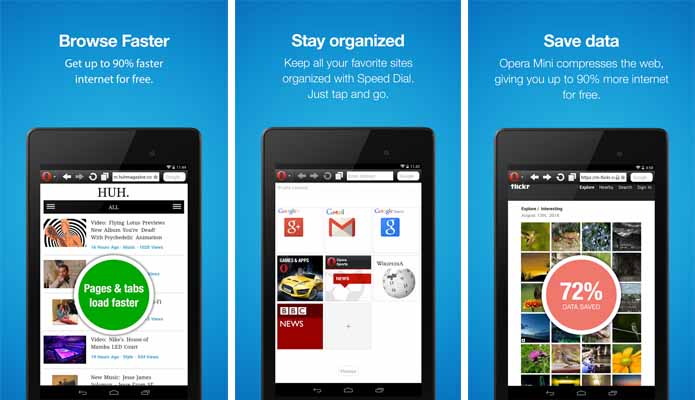 Opera je također jedan od najomiljnijih Android preglednika, a neke od opcija koje posjeduje nema ni Chrome ni Firefox. Na primjer, Off-Rode način prikazivanja je izvrstan ako posjedujete uređaj sa slabijim procesorom ili imate sporiju internet vezu, pošto ova opcija pojednostavljuje izgled stranice, a samim time i štedi potrošnju prometa. Pomoću opcije Speed Dial možete u jednom potezu prsta organizirati oznake u mape i tako si uvelike olakšati snalaženje. I na kraju, mogućnost Discover donosi popis najnovijih vijesti iz odabrane države ili regije, a također je moguće odabrati temu o kojoj želite čitati. Sinkronizacija s drugim uređajima provodi se pomoću Opera Links, a jedina zamjerka je što morate imati uređaj s Androidom 4.0 ili novijim kako biste je mogli instalirati.