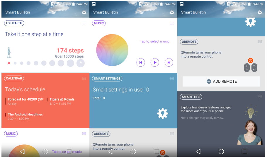 Ono što vam sigurno neće promaknuti je i novi LG Smart Bulletin – sustav prikaza aplikacija i widgeta preko cijelog zaslona do kojeg se dolazi ako na početnom ekranu povučete prema desno. Smart Bulletin sadrži kalendar, LG Health fitness aplikaciju, QRemote aplikacija za daljinski, i ostale korisne stvari koje često koristite. Ono što posebno dolazi do izražaja je bolja produktivnost koja dolazi uz ovaj 5,5 inčni zaslon a dobro je implementirana pomoću Dual Window načina rada. On dijeli zaslon na pola te omogućuje korištenje dvije aplikacije odjednom. Za kraj, tu su i dobro poznati KnockOn i KnockCode načini otključavanja.
