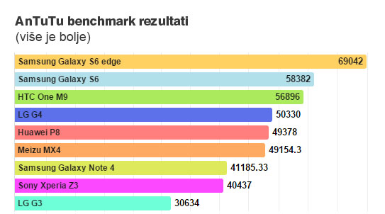 Što se tiče hardvera, LG G4 specifikacije nisu u samome vrhu na tržištu, no nude i više nego što je potrebno prosječnom korisniku. Mobitel pokreće Snapdragon 808 čipset, s četverojezgrenim 1.44 GHz Cortex-A53 procesorom i dvojezgrenim 1.82 GHz Cortex-A57. Uz to, Adreno 418 GPU i 3GB radne memorije brinu se za dobre performanse u praksi, iako bi one teoretski mogle biti puno bolje. Zašto kažemo teoretski? Zato što benchmark rezultati nisu baš toliko sjajni. Još jednom se pokazalo da softverska optimizacija igra značajno veću ulogu od pukog nabrijavanja radnog takta i podizanja radne memorije. LG G4 je u GeekBench 3 i Antutu aplikacijama za testiranje ostvario slabije rezultate od nekih konkurentskih uređaja nego što smo očekivali. No nemojte misliti da je G4 zbog toga loš. Benchmark rezultati nisu mjerilo kvalitete i brzine uređaja u stvarnome svijetu. I dalje možete uživati u svim grafički zahtjevnim igrama, a prosječan korisnik teško da će osjetiti kako mu fali procesorske snage ili radne memorije. Ipak se radi o flagship uređaju.