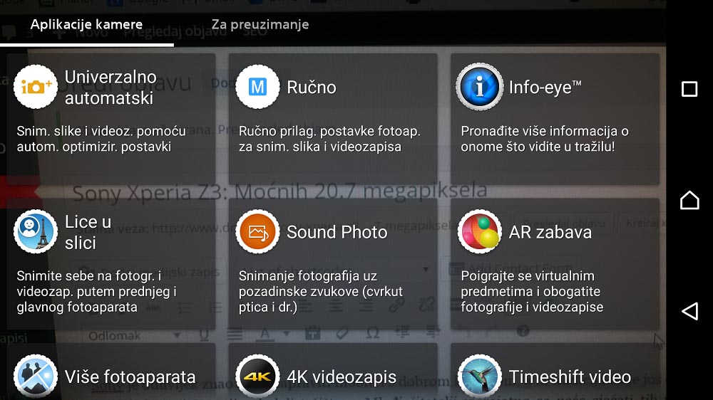 Od ostalih mogućnosti naći ćete Augmented reality aplikaciju koja u scenu dodaje zanimljive efekte, Panoramu, Timeshift video, značajku koja simulira plitak DOF, ali i mnoštvo drugih mini aplikacija unutar kamere koje možete obogatiti preuzimanjem dodatnih paketa s Trgovine Play.
